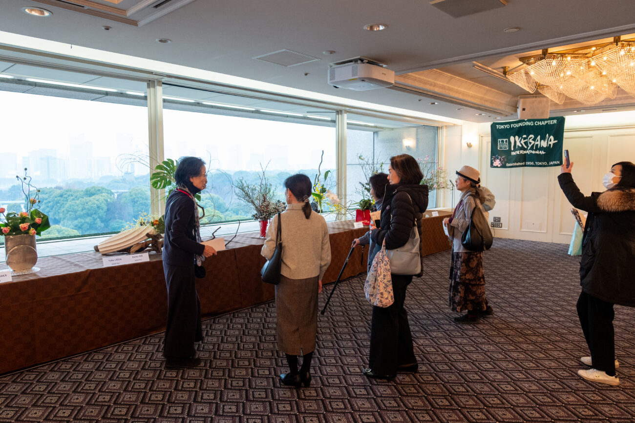At the opening ceremony, the wife of the Minister for Foreign Affairs, Dr. Yuko Hayashi, the wife of the Angola Ambassador, the President of the Ikebana International Headquarters, and the President of Tokyo founding Chapter cut the ribbon.