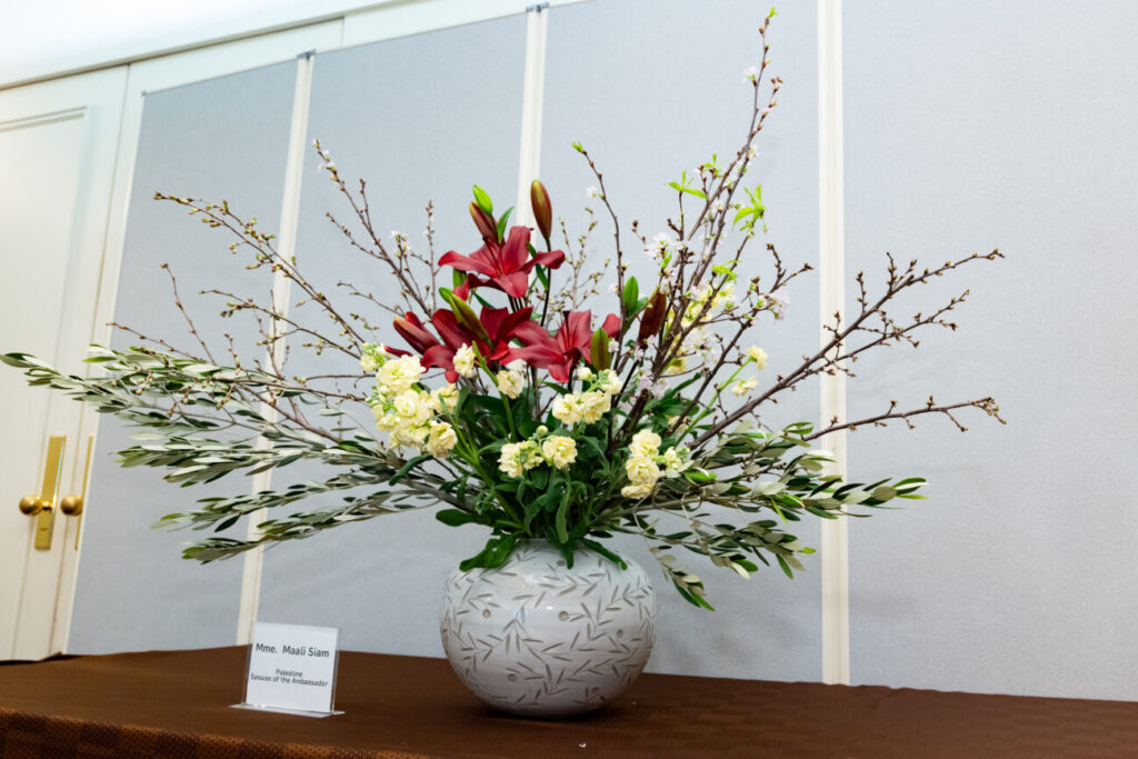 お家元は、郁生流・いけばな白鳳会・遠州流一森会や大使館からは、クロアチア・パレスチナ・チュニジア・イエメン・カタールの大使夫人が御出瓶下さいました。いけばなワークショップも開催し、大変喜んでいただきました。