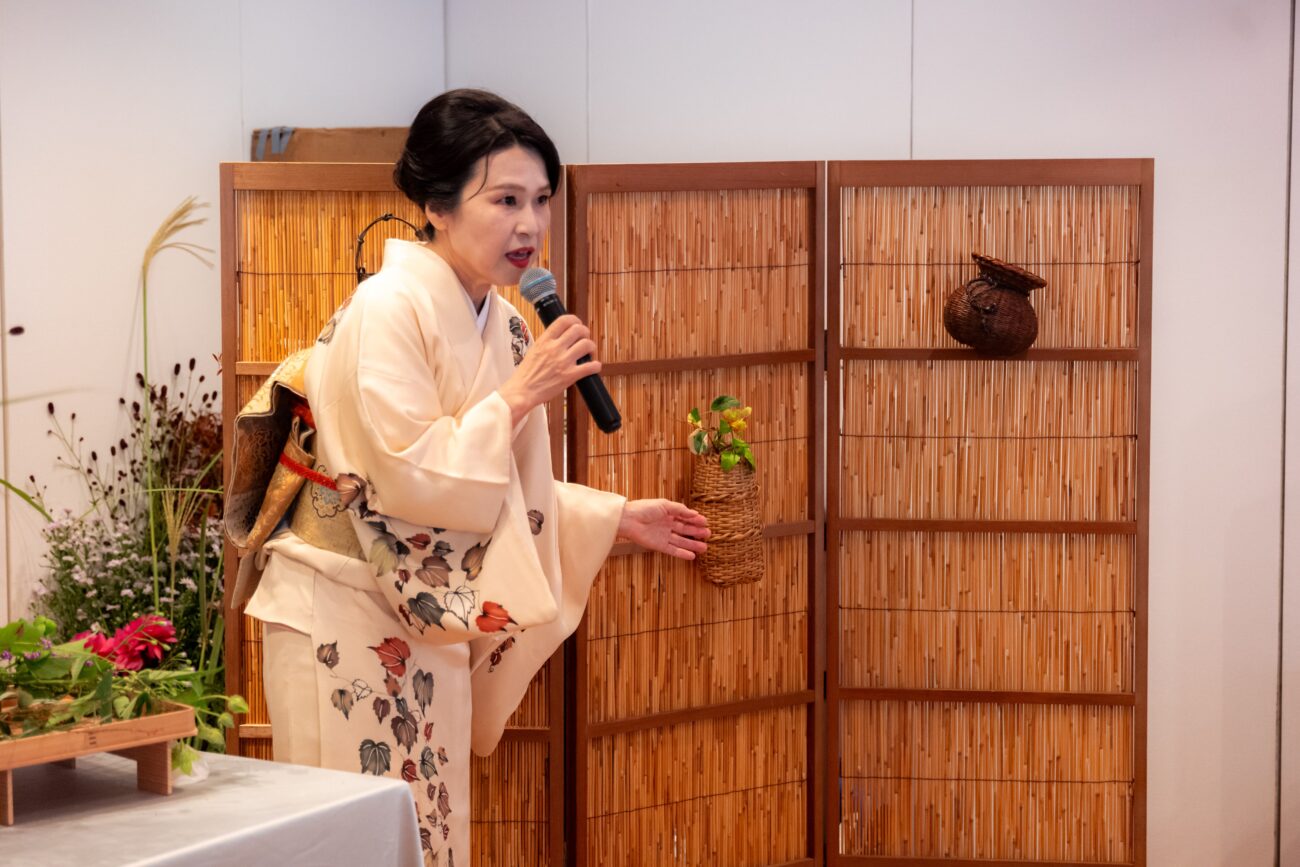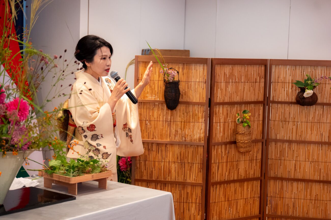 Ms. Masae Sawai, the third-generation Iemoto of Ikuseiryu, presented an ikebana demonstration under the theme “the Beauty of Tradition, the Creative Floral Space.”